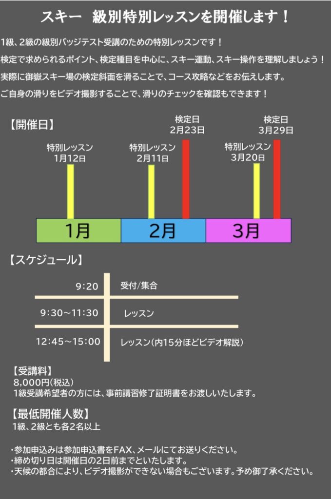 御嶽スキー場では、1級・2級の級別バッジテスト受講に向けた特別レッスンを開催します。