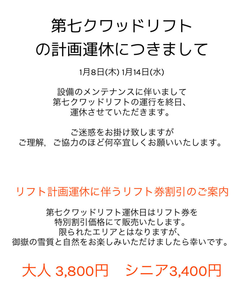 第七クワッドリフト運休日は、滑走可能エリアが一部限定されることから、リフト券を特別割引価格にて販売いたします。