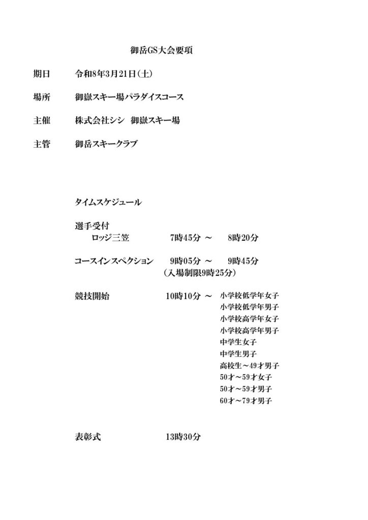 第1回おんたけスキーGSカップのお知らせ